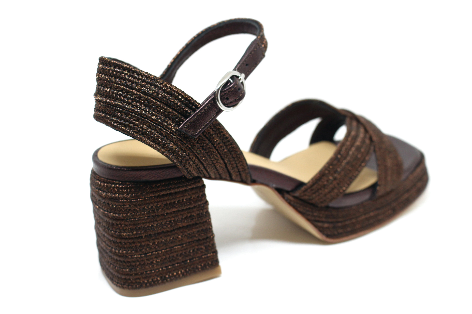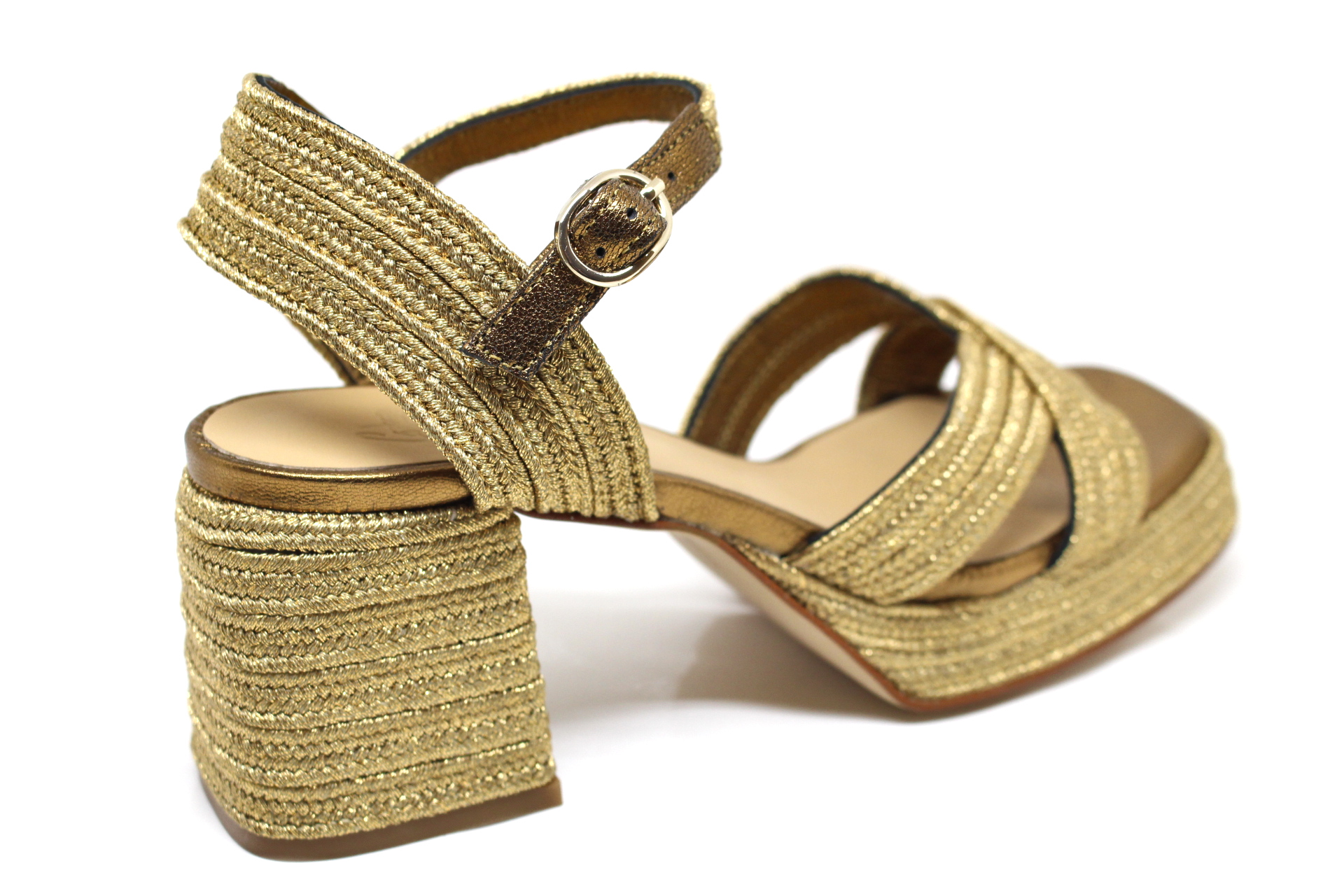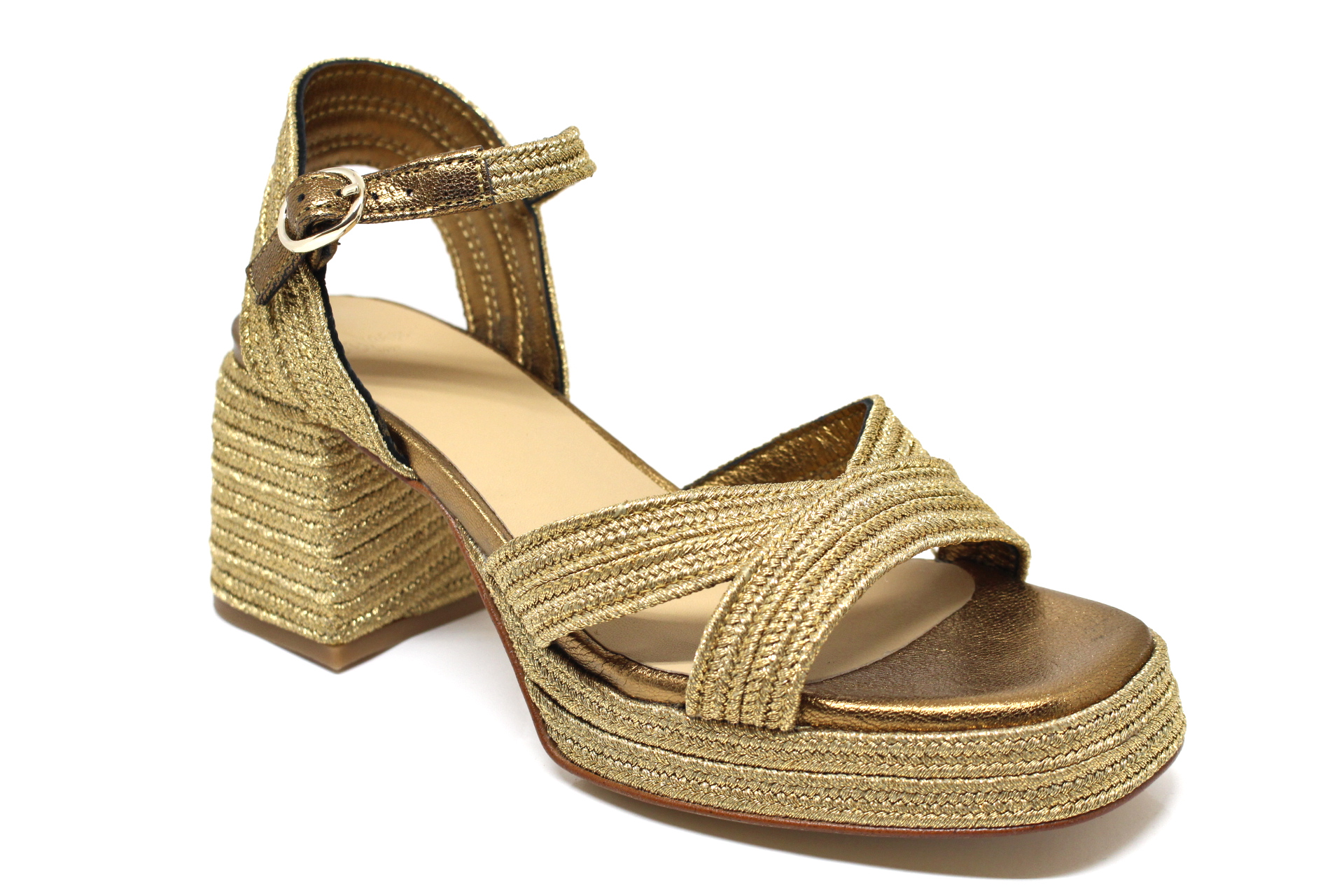 Valeriette sandalo in pelle e rafia, fondo cuoio con plateau, tacco cm 10,0