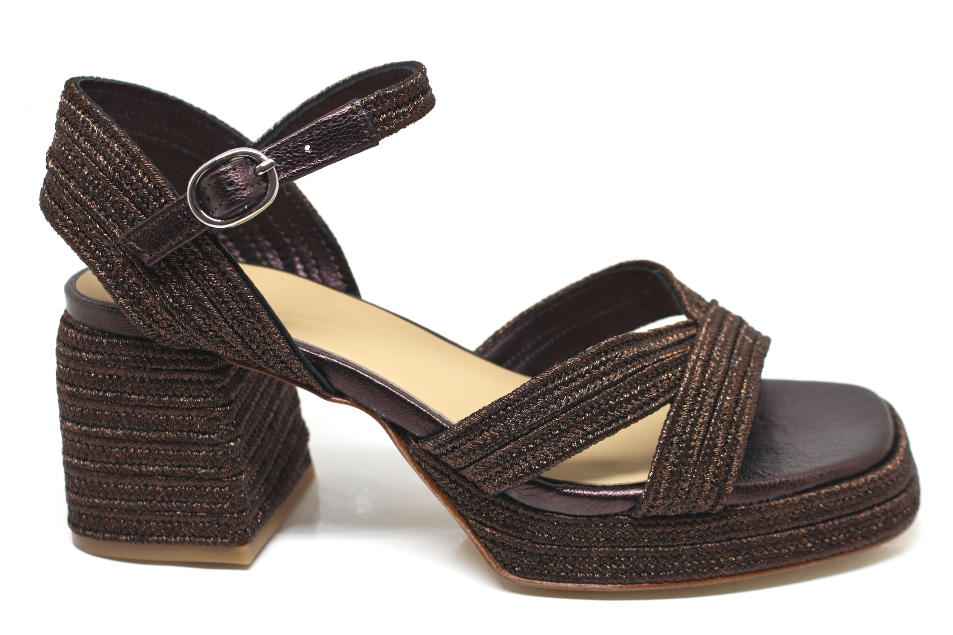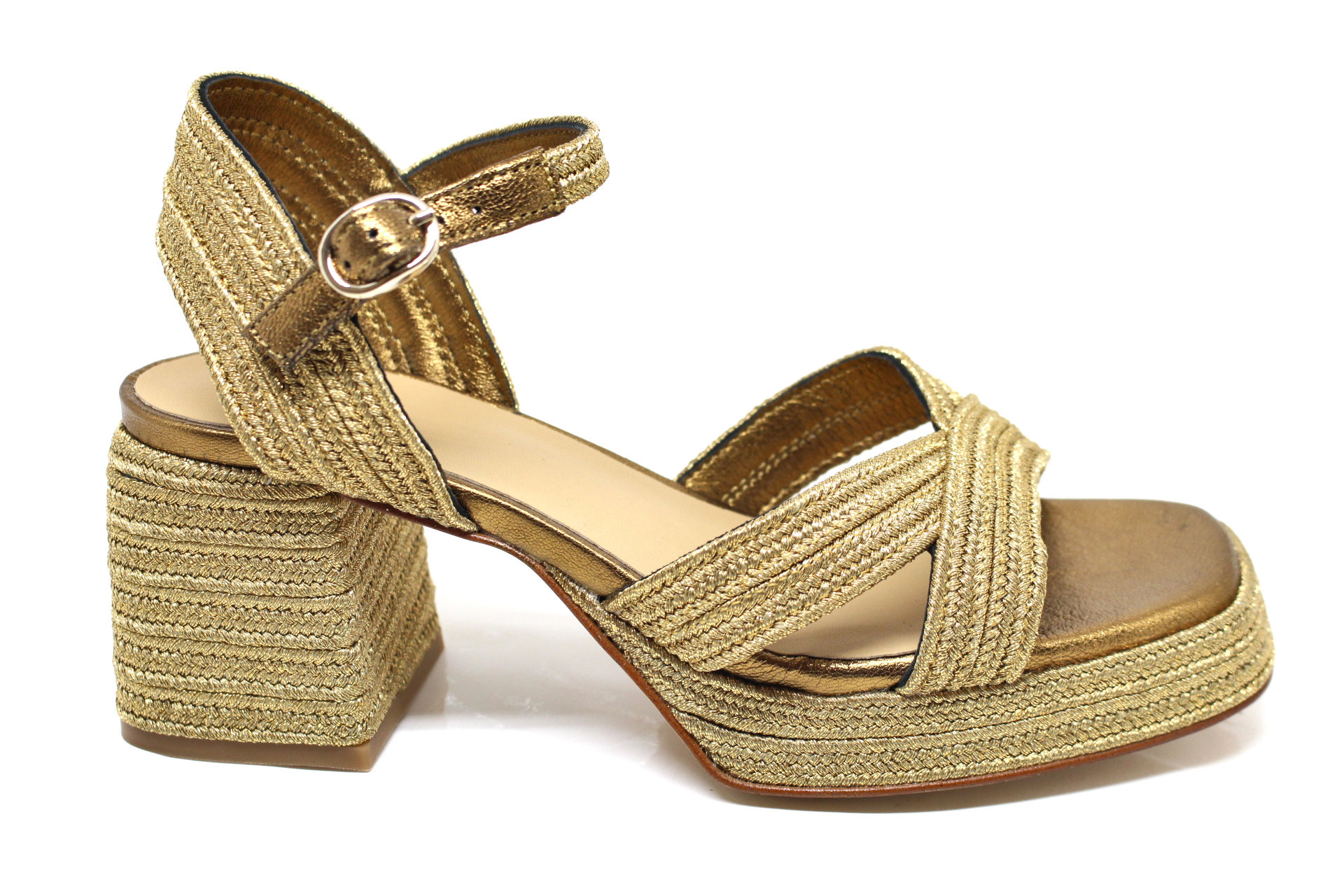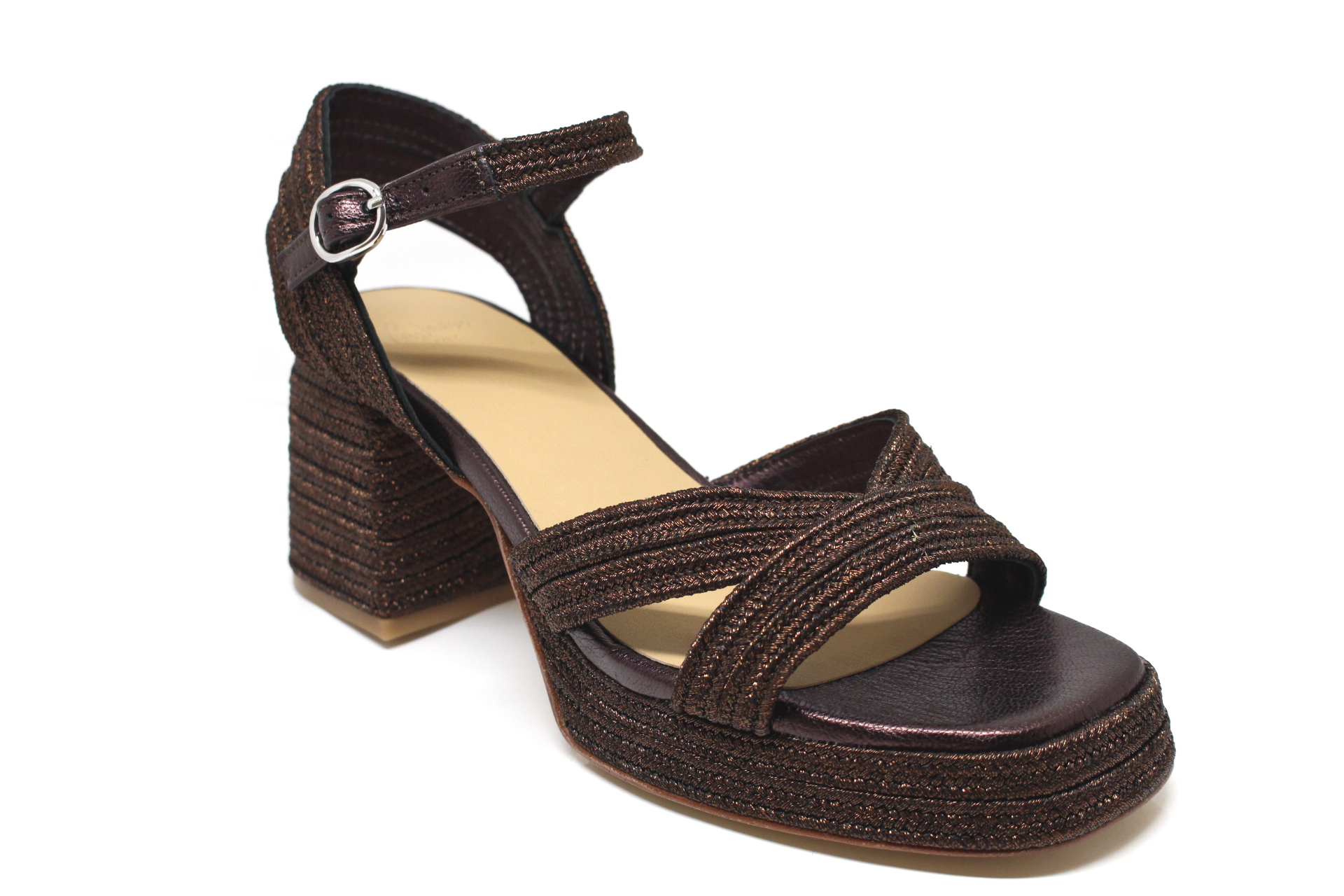 Valeriette sandalo in pelle e rafia, fondo cuoio con plateau, tacco cm 10,0