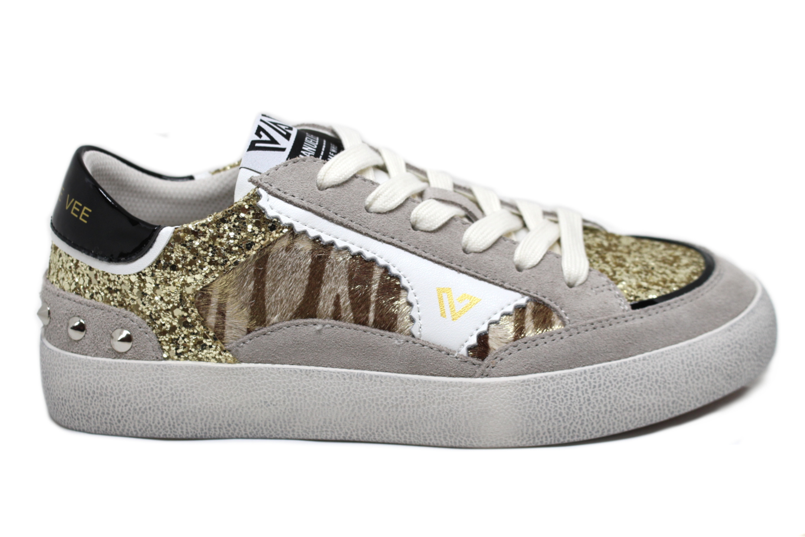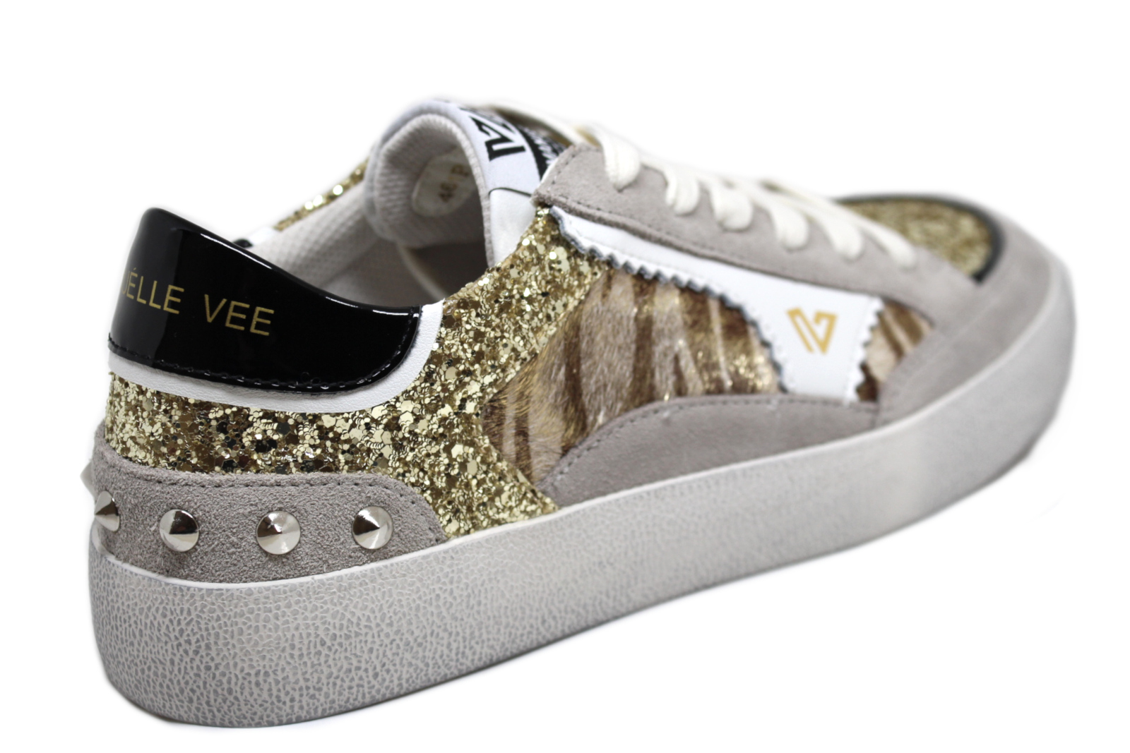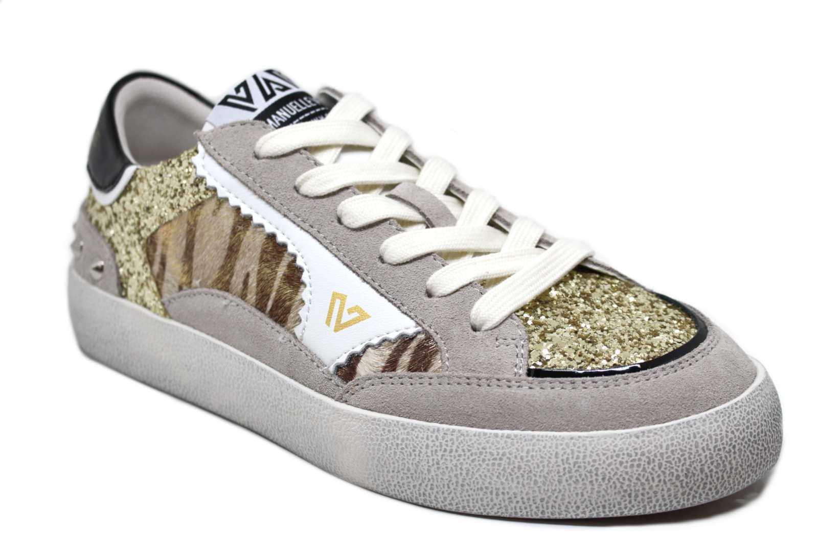 Sneakers stringate in pelle e multi materiali con strass, fondo gomma cassetta