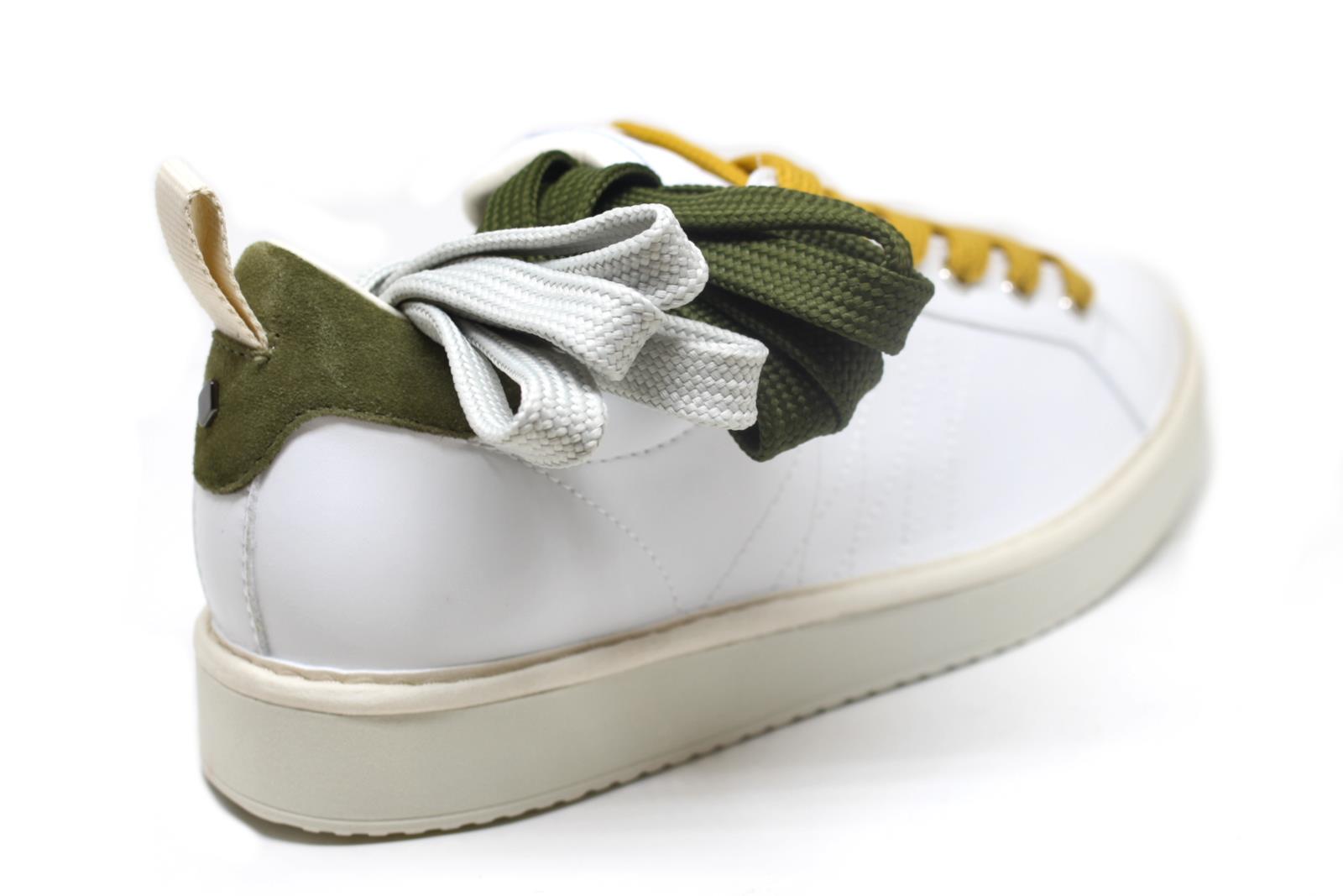 Pànchic bassa allacciata P01 con tomaia in nappa riciclata di colore bianco, lacci a trama larga e spoiler in suede sostenibile, suola in gomma.