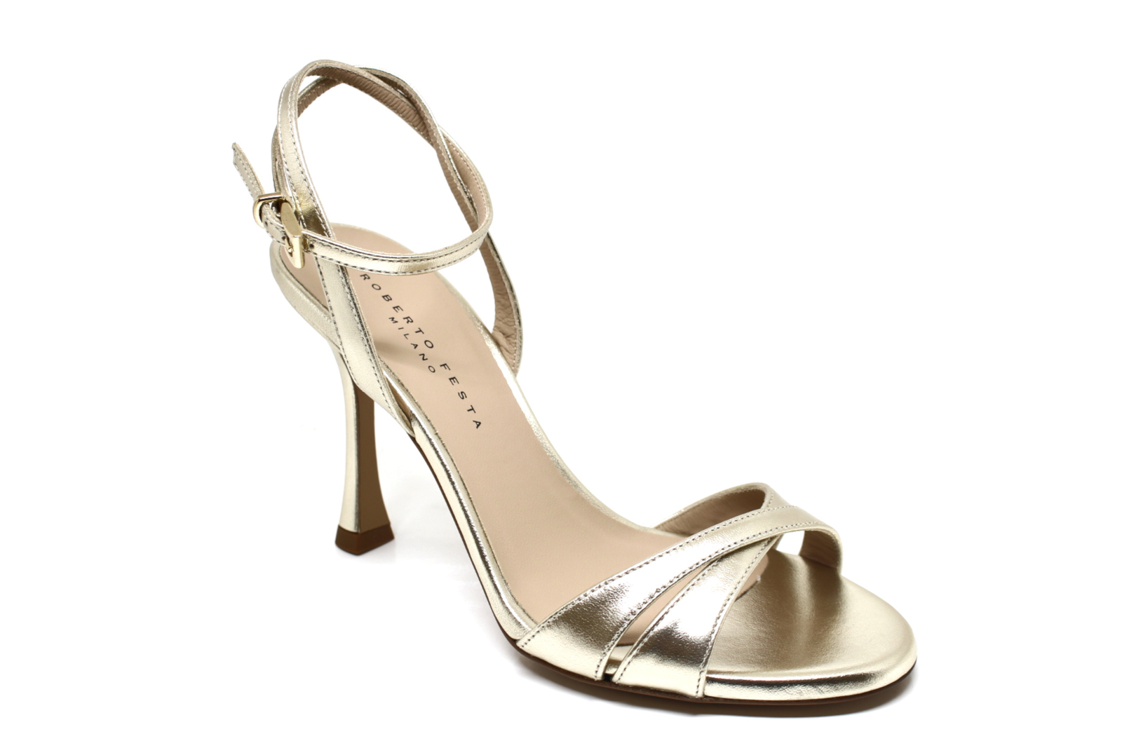 Sandalo Donna in pelle metallizzata, fondo cuoio con tacco cm 9,0, realizzato interamente a mano in Italia, col suo fine cinturino e il tacco a stiletto classico da 9,0 cm conferisce un'immediata raffinatezza ed equilibrio, in contrapposizione con la morbidezza dei materiali e la modelleria avvolgente, si crea così il giusto mix per definirla una calzatura unica.